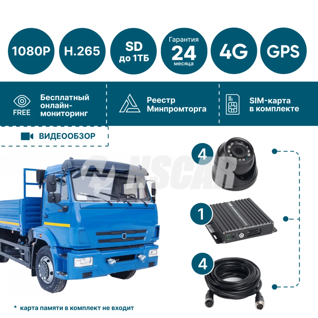 Готовый комплект видеонаблюдения NSCAR GT401_SD для грузового транспорта: 4 камеры, запись на SD, поддержка 4G, GPS/ГЛОНАСС.